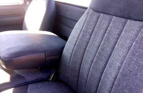 drink holder from the lean back making it a solid armrest and then stretching the seat bottom out a near three inches and raising the nose to houses stainless cupholders then was inserted with tweed and the leather alternative wrapped in graphite vinyl. Now bring the 1995 buckets back to the 1992 design and give them the same treatment with the tweed having pleats sewn and the graphite vinyl on the outer side of the lean back changing into a graphite hard cloth running into the seat bottom to wrap the bottom in the hard cloth skirting.