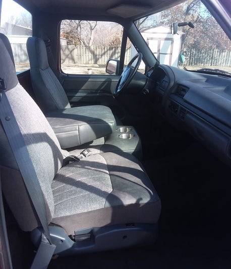 Wanting an interior in the truck that looked like it came out in the 90s I used tweed as a focus point, with this the headliner has an Embossed Ford logo then covered with grey heather tweed with matching sun visors. Then bringing today into the truck the fun began with the door panels modified with charcoal leather alternative inserts and new carpet in a graphite. The trim from door to door across the dash was wrapped in black edge (a very fine carbon fiber) to add details. The seat well wanting a set of 40/20/40 out came the stock bench to make room for the 1995 Ford Super Cab buckets with the center jump seat. The jump seat went into lots of details from first removing the storage/